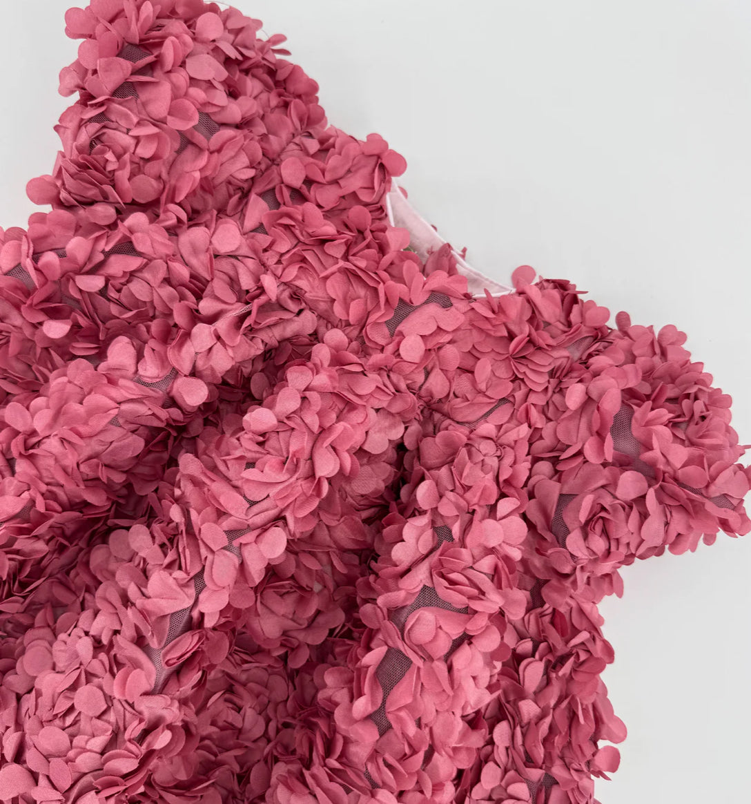Petali rosa per l'abito al ginocchio con maniche a sbuffo