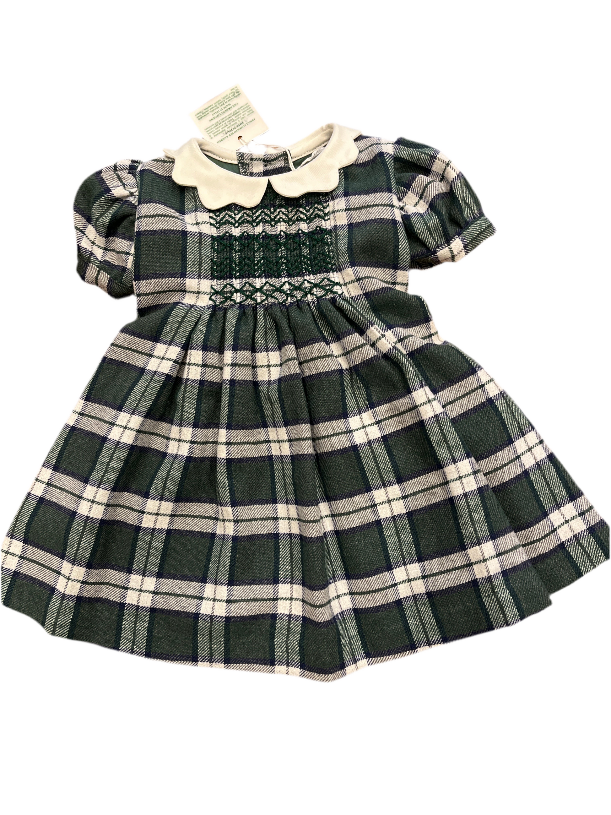Abito scozzese bianco e verde con ricamo punto smock e colletto a fiore bianco, in cotone organico e bio