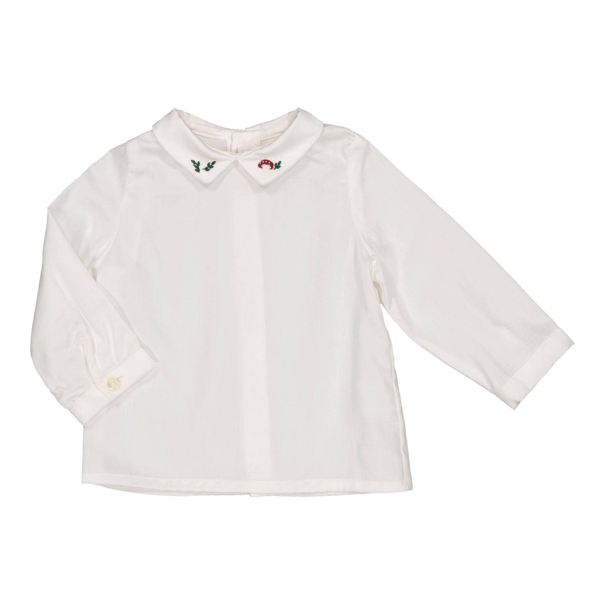 Presentiamo Billy, l'aggiunta perfetta al guardaroba del tuo bambino! Questa affascinante blusa a maniche lunghe presenta un classico colletto mac milan e un adorabile ricamo di funghi rossi, aggiungendo un tocco fiabesco a qualsiasi outfit. Realizzata in cotone twill organico bianco sporco al 100%, puoi stare tranquillo sapendo che è non solo comoda ma anche ecologica.
