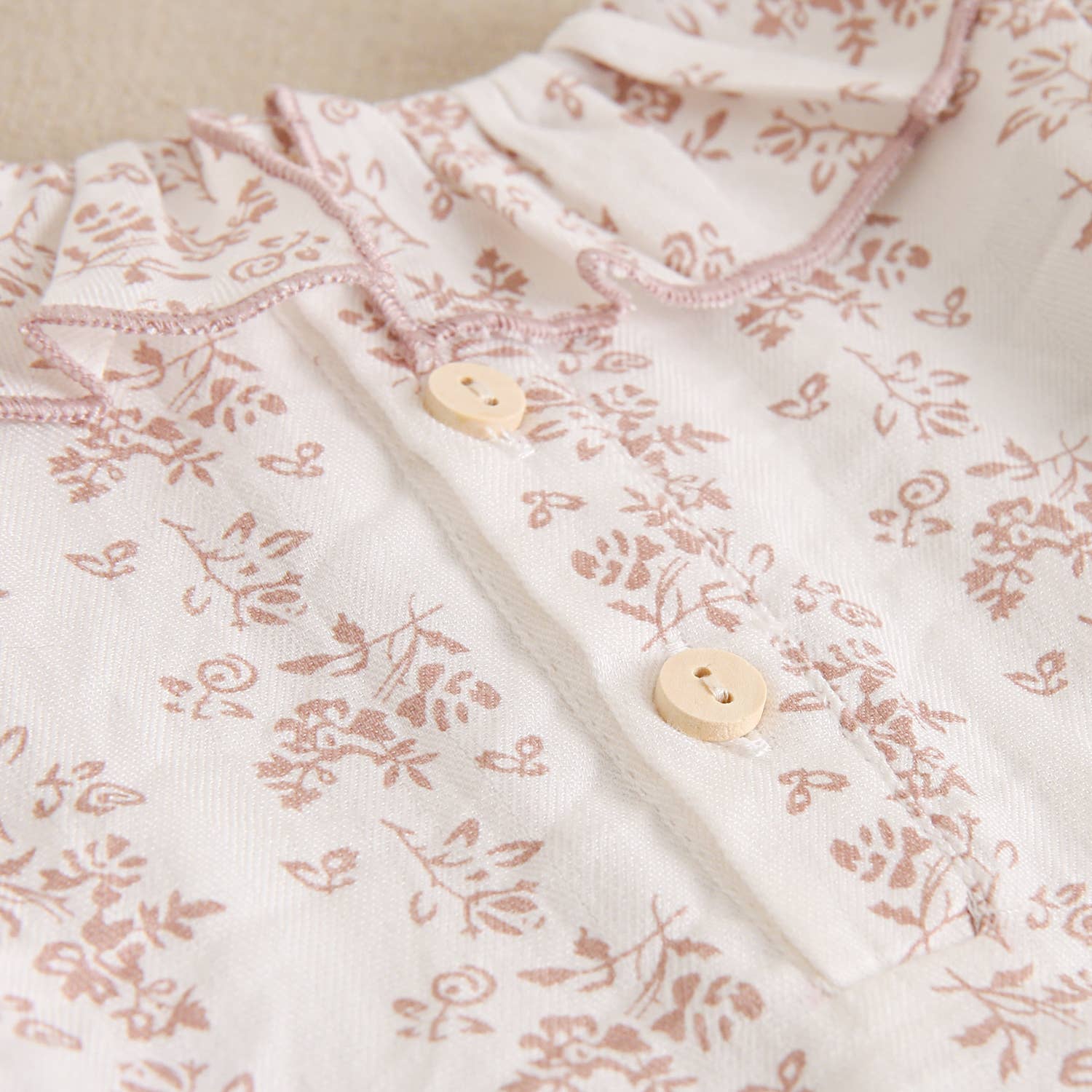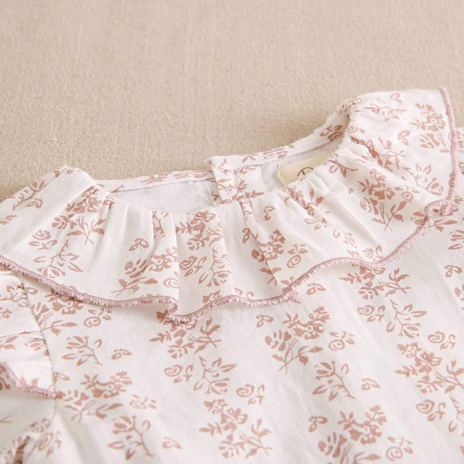 Blusa da neonata con stampa floreale rosa e colletto a balze con ricamo rosa. Rouches sulle spalle. Manica lunga con polsino elastico.