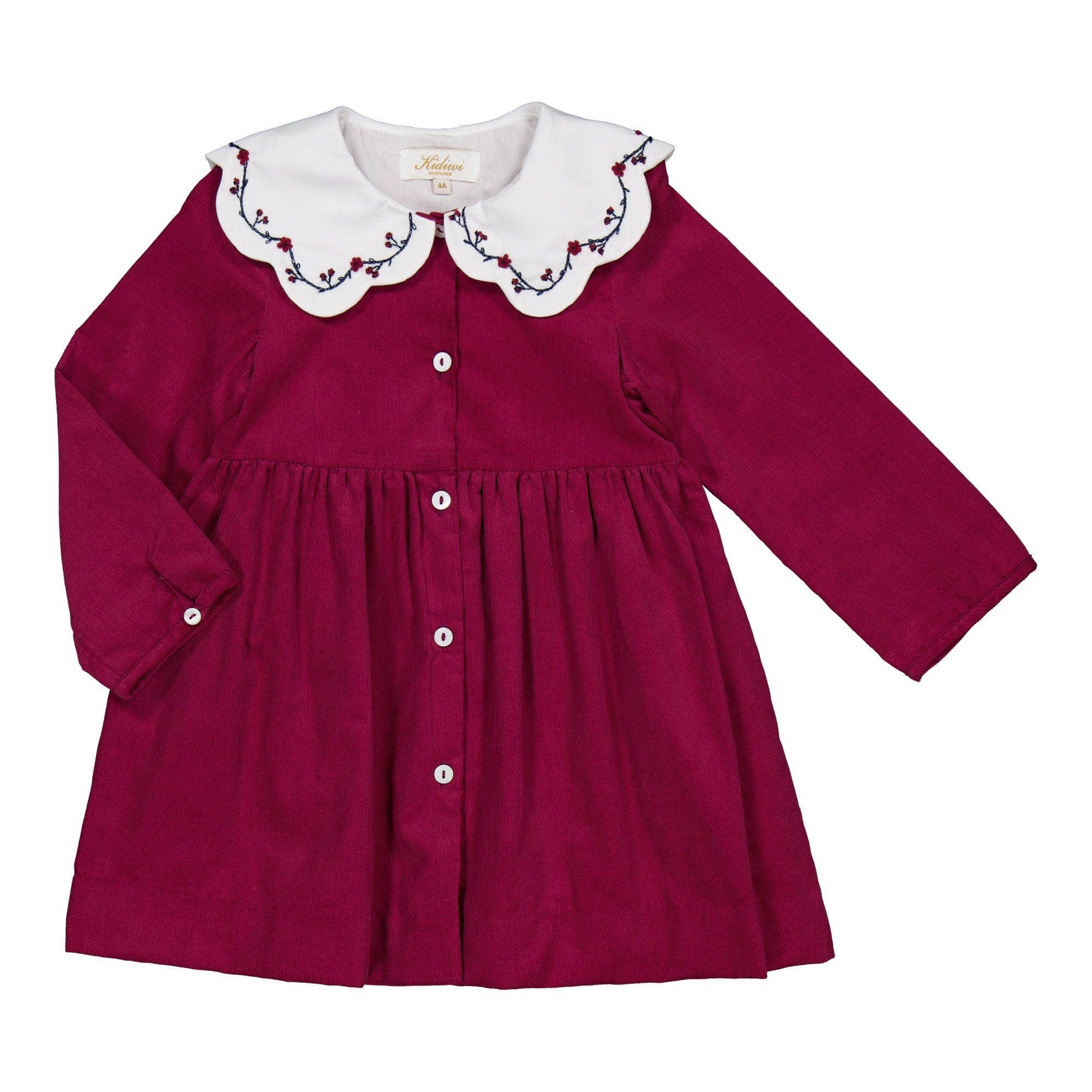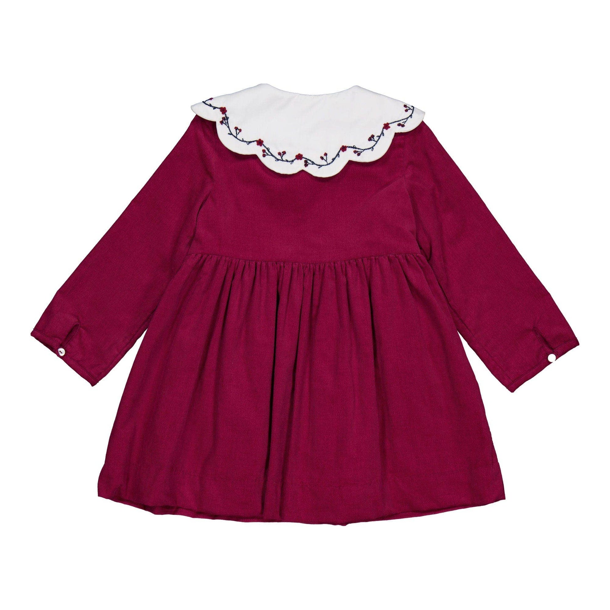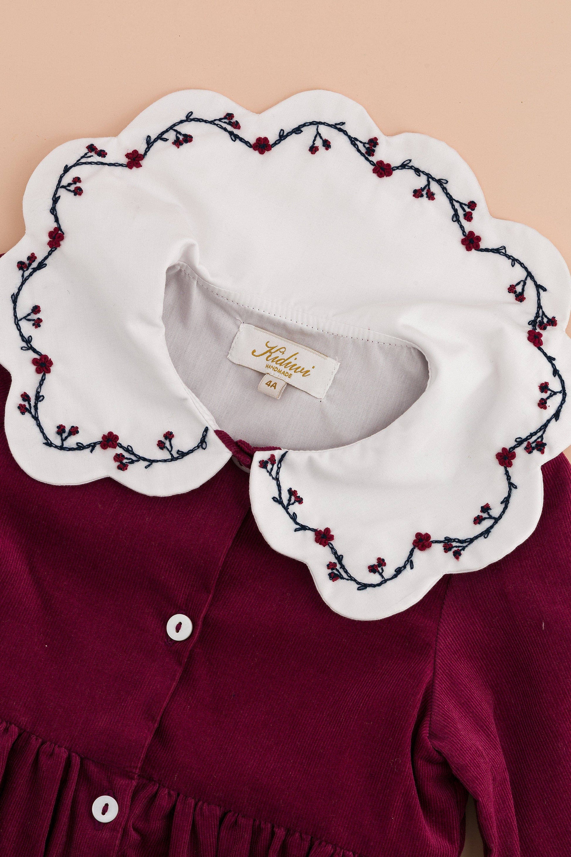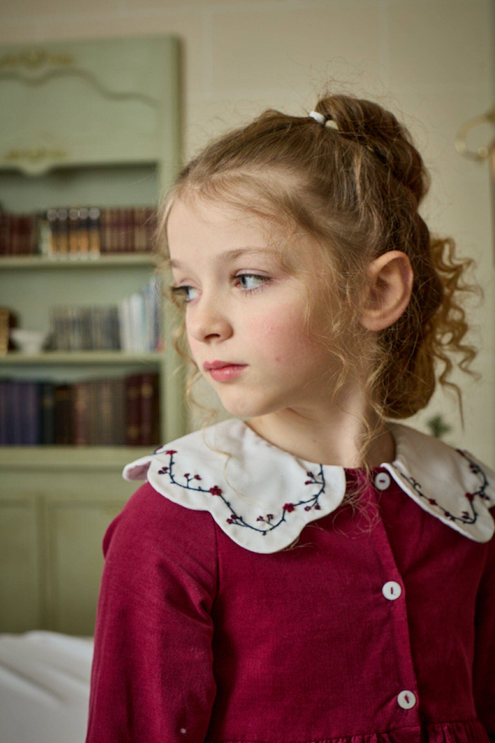 Ecco Colette, il nostro abito a maniche lunghe con un grande colletto smerlato ricamato e un'apertura sul davanti, in velluto a coste bordeaux