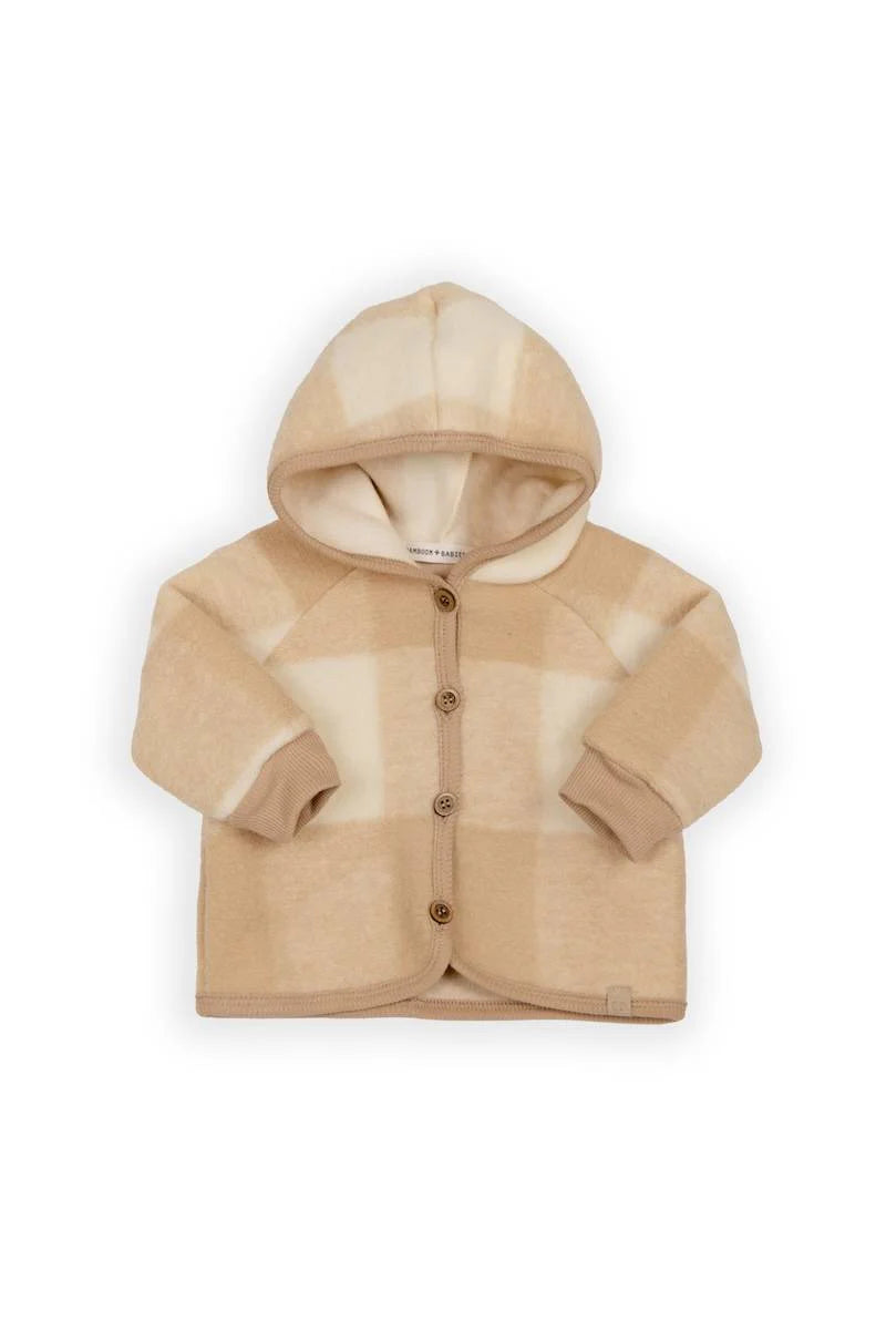 Il design con cappuccio integrato è pensato per offrire una copertura extra, mentre l’apertura frontale con bottoni in legno rende la vestizione semplice e veloce. Le cuciture arrotondate e i colori tenui donano un tocco dolce e raffinato.