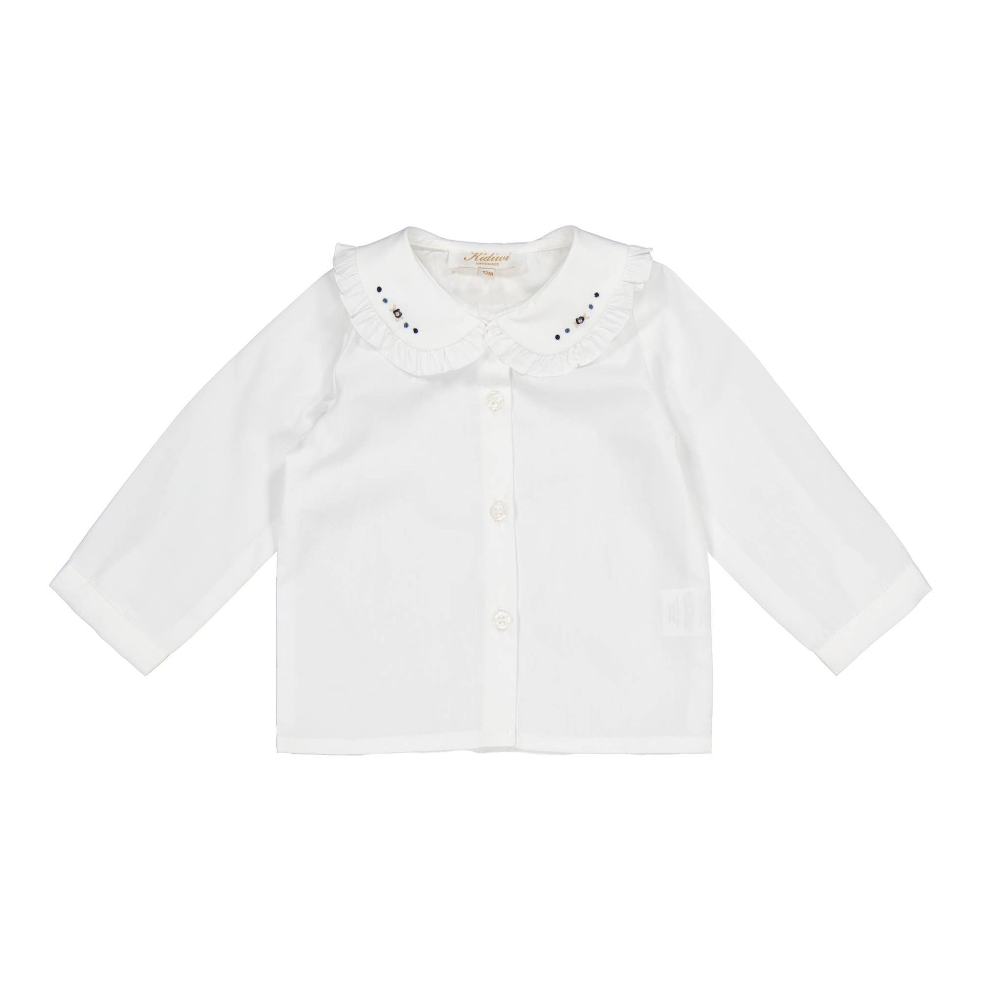 Hélena, Camicetta da ragazza, in popeline bianco con ricamo blu navy