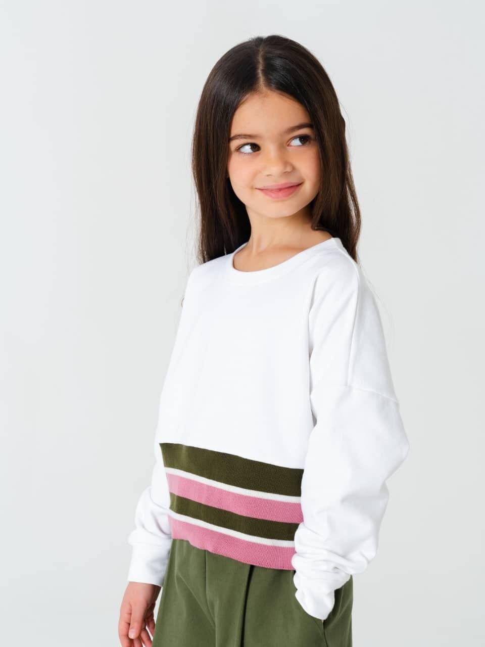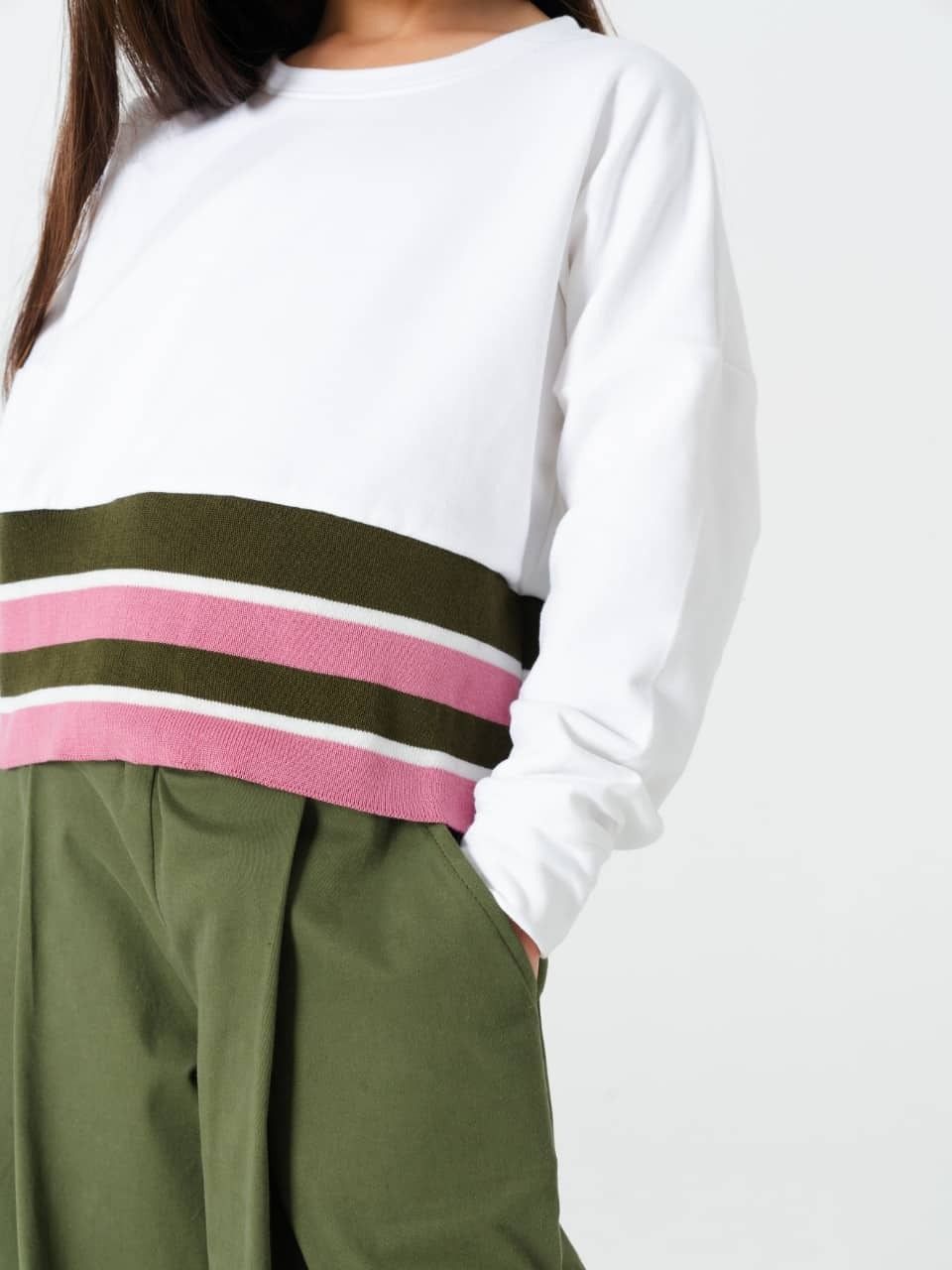 Maglia crop realizzata in felpa di puro cotone trattata al carbonio, che conferisce all’articolo una morbida mano pesca.