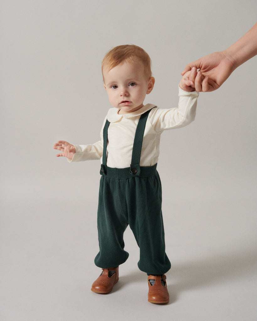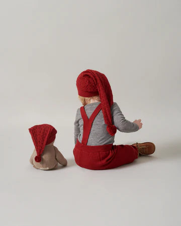 Pantaloni in maglia con bretelle removibili, dal colore rosso intenso, ideali per un look natalizio e festivo.