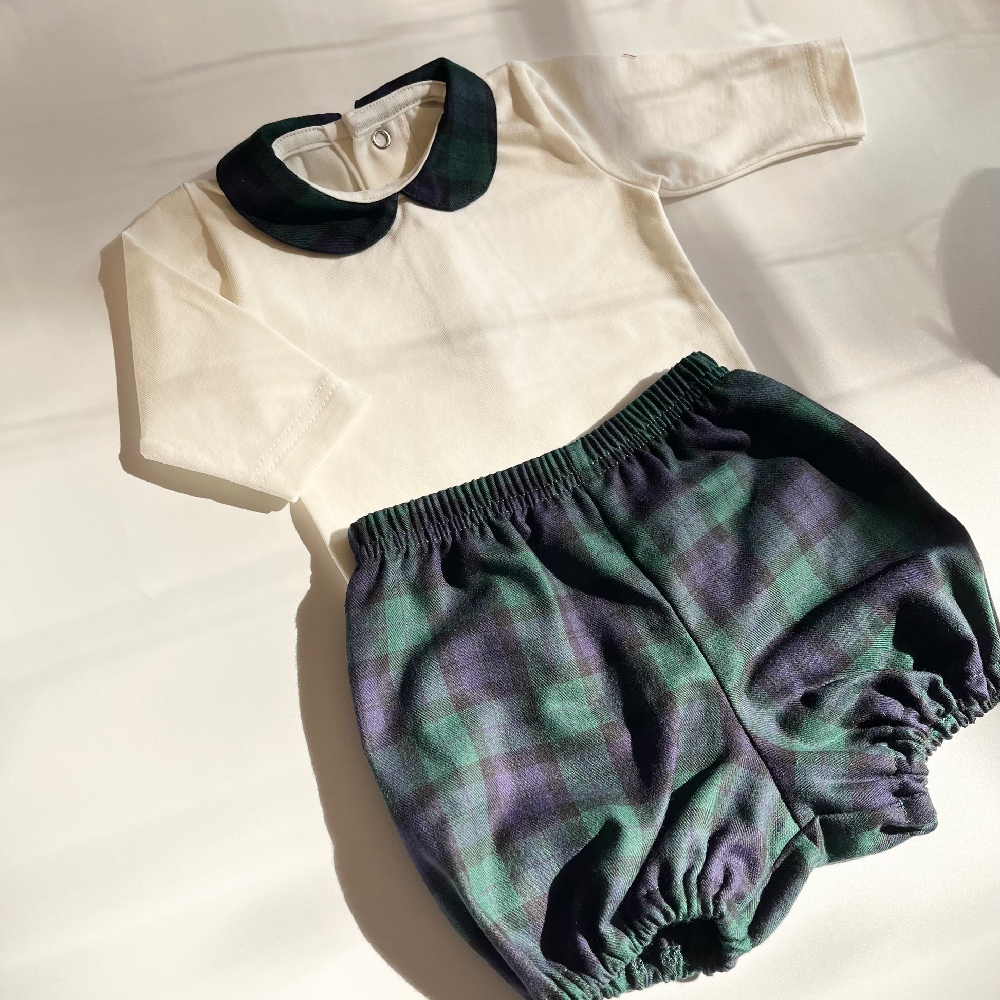 Set 2 pz coulotte + body con colletto scozzese verde in cotone organico