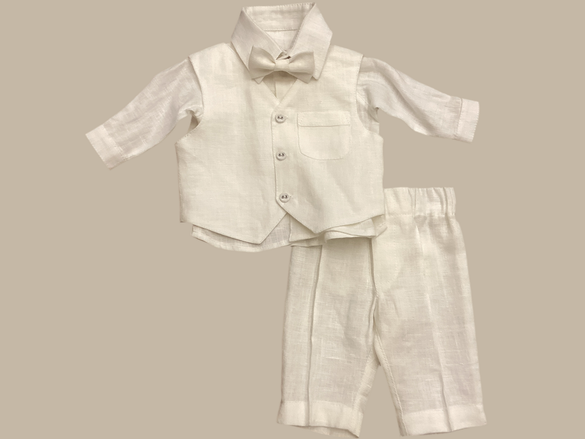 I pantaloni da battesimo in lino sono estremamente morbidi e facili da indossare: includono un elastico in vita. Il gilet può essere indossato con una camicia a maniche lunghe o corte. L'abito fa sembrare il ragazzo un vero gentiluomo.